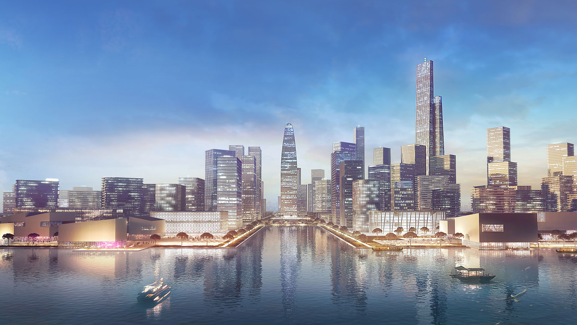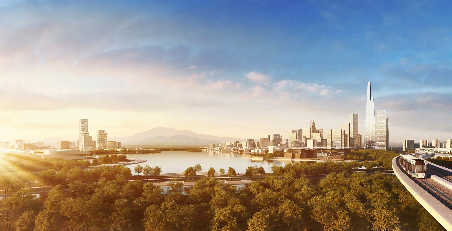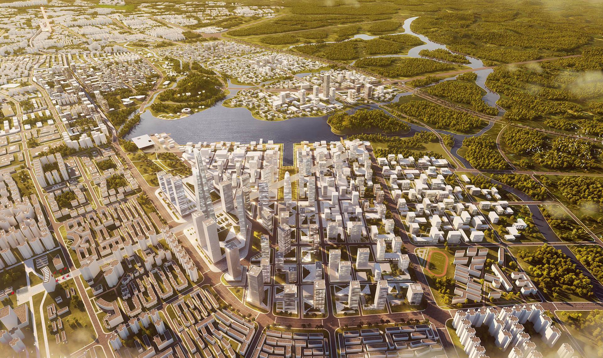 A view from the western side of artificial lake, presenting residential district on the left and CBD on the right side.