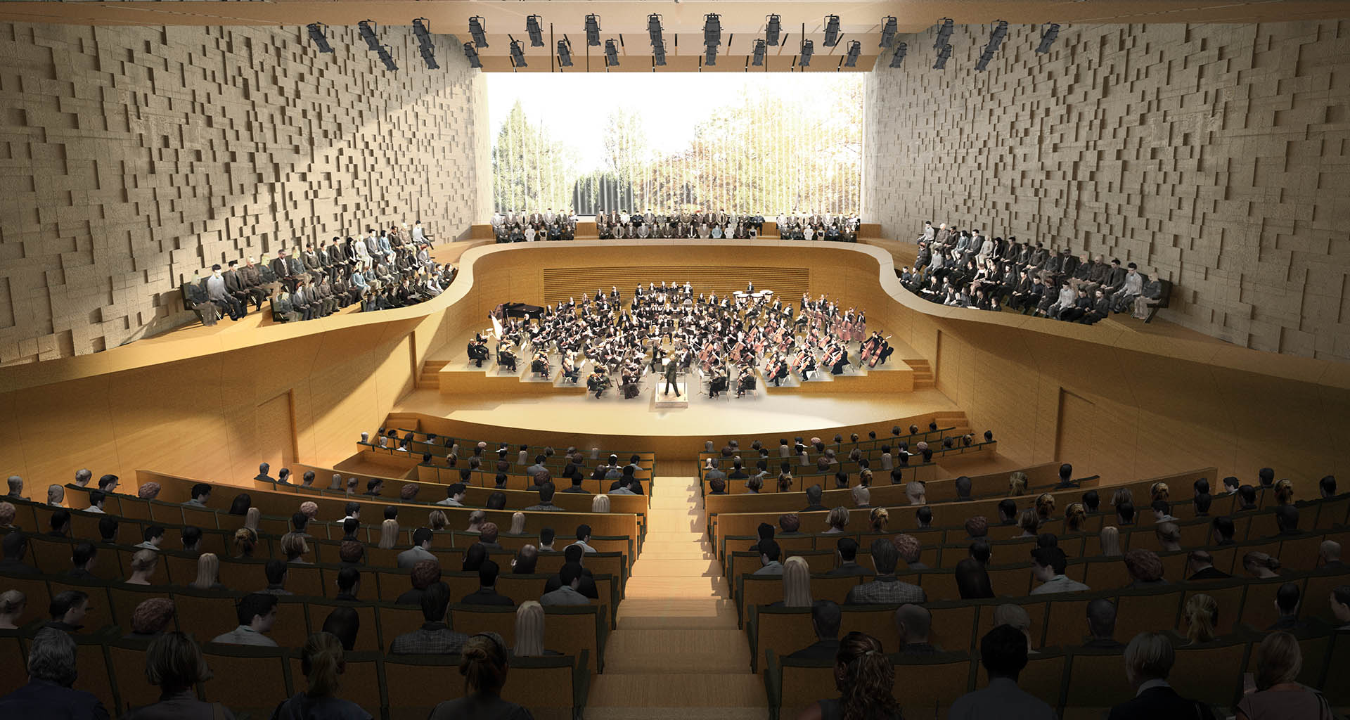 We decided to split all departments of the academy into isolated buildings, creating small plazas between them where integration could happen. I was directly responsible for providing a comprehensive concept of the main concert hall including acoustic optimization.