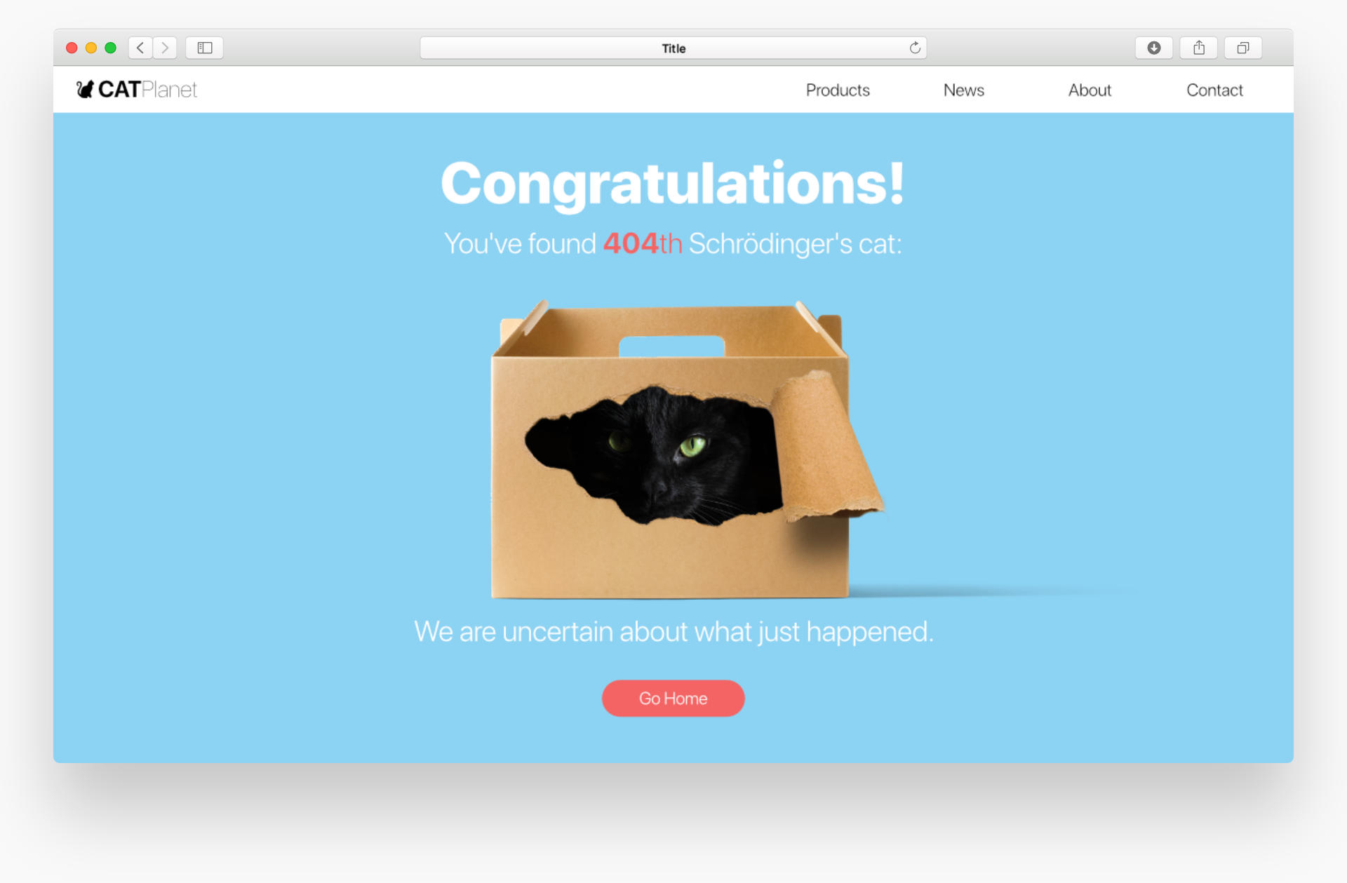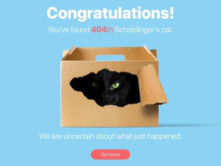 The eight DailyUI #008 Challenge: 404 Page. Schrodinger's cat is a quantum creature, no one is truly certain what is happening to her.