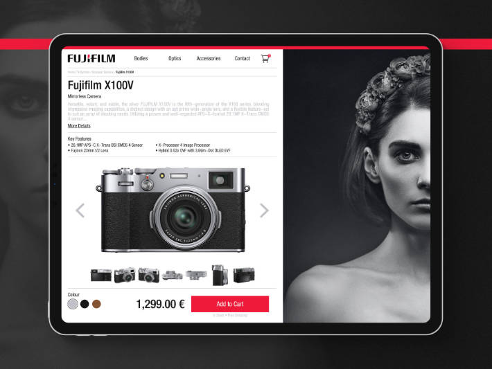 The 12th DailyUI #012 E-Commerce Shop (Single Page). Fujifilm store concept page, the main idea was to promote authors using the following system. Stock picture by: @dtolokonov.