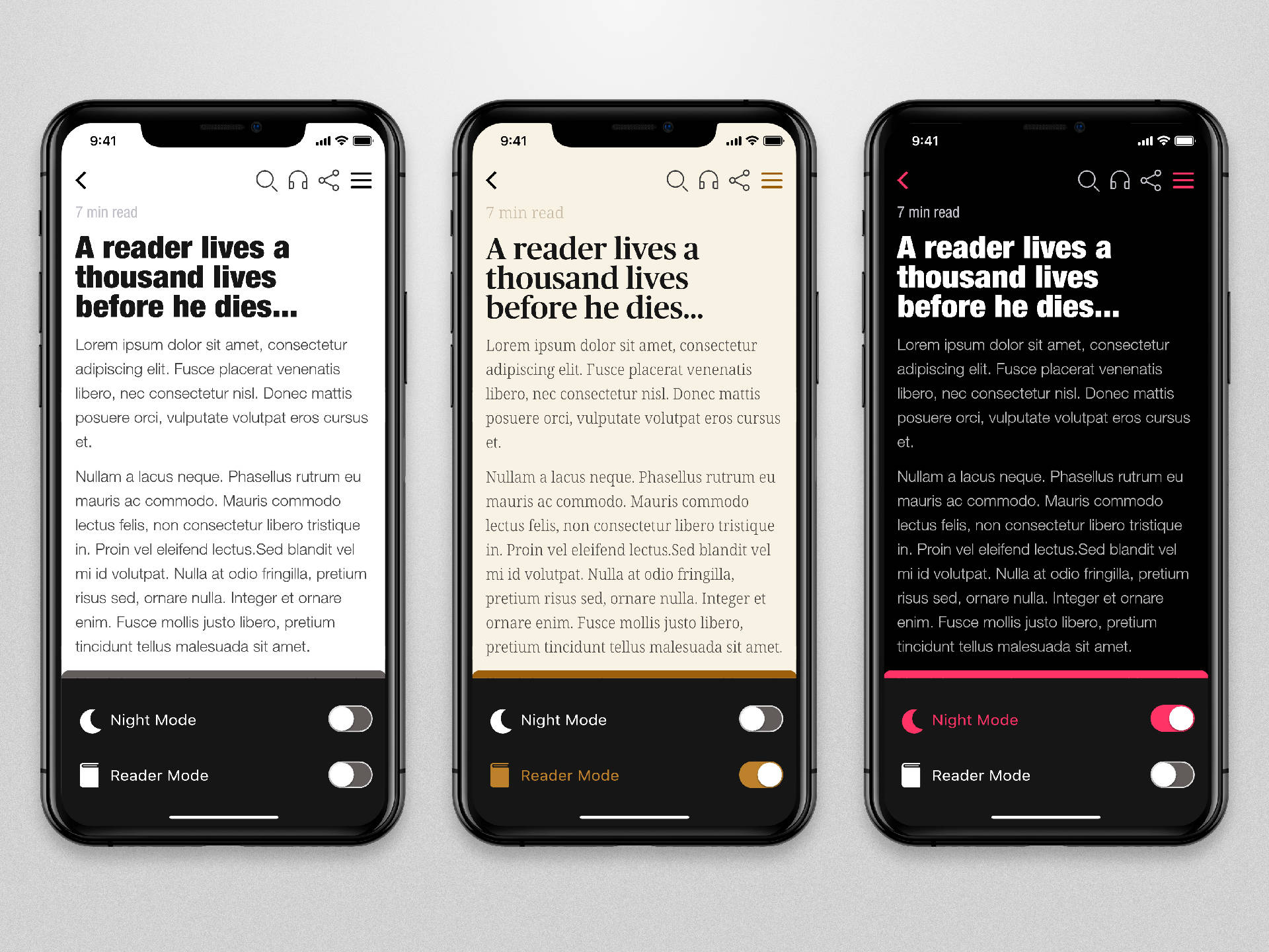 The 15th DailyUI #015 Switch On/Off. The Switch On/Off concept was inspired by a reader app that allows you to save articles for later. My main concern was to allow users to adjust article display modes according to their preferences.