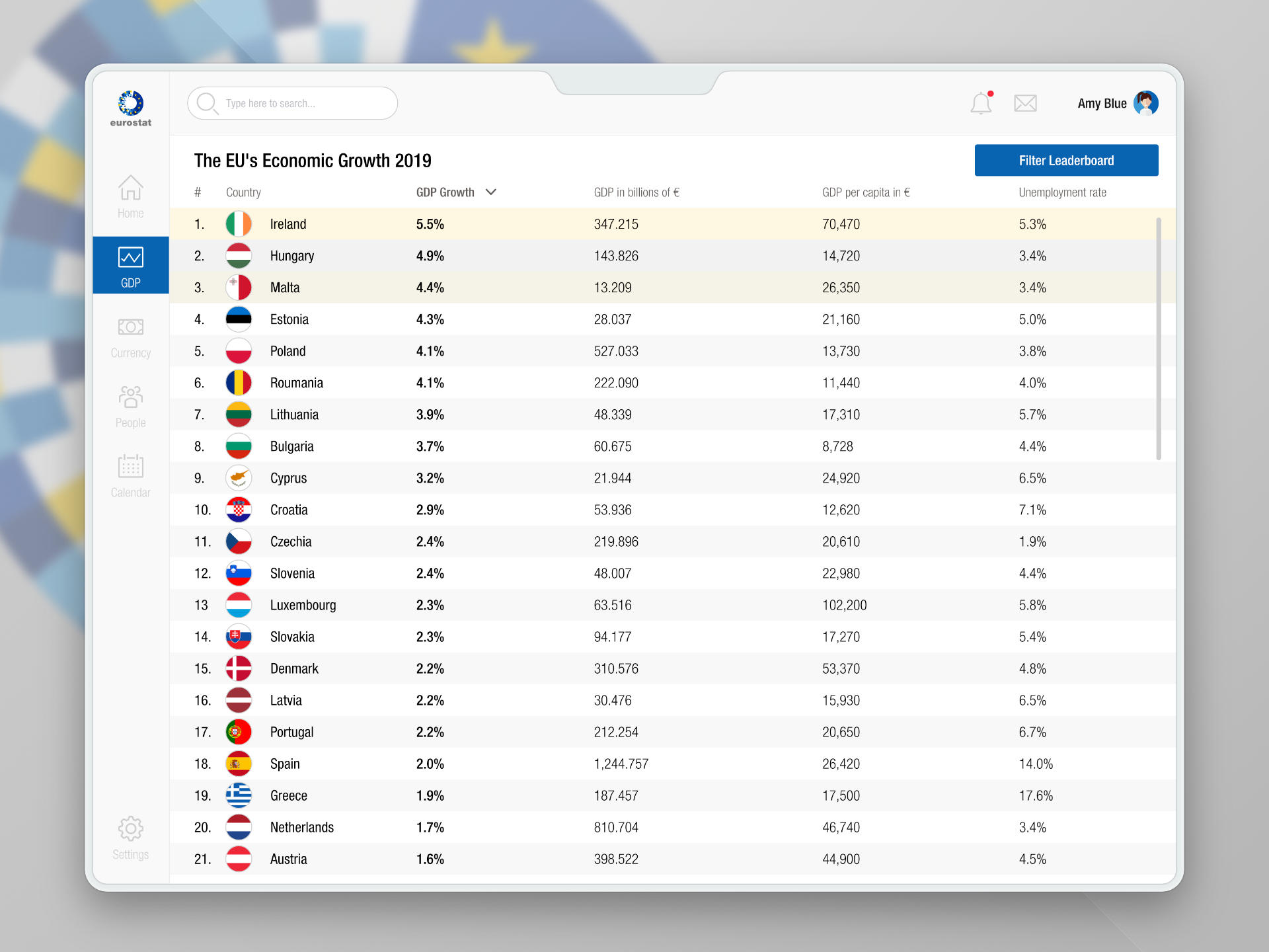 The 19th DailyUI #019 Leaderboard. The leaderboard was inspired by Eurostat's statistics concerning the GDP growth of European Union members.