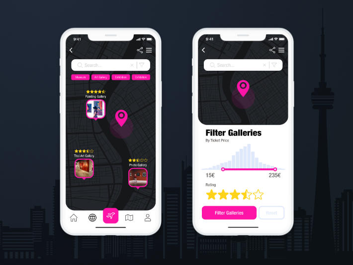 The 20th DailyUI #020 Location Tracker. The Location Tracker concept incorporates the idea of a Gallery Search Engine, where the user could easily find interesting exchibitions. She could also visit them virtually.