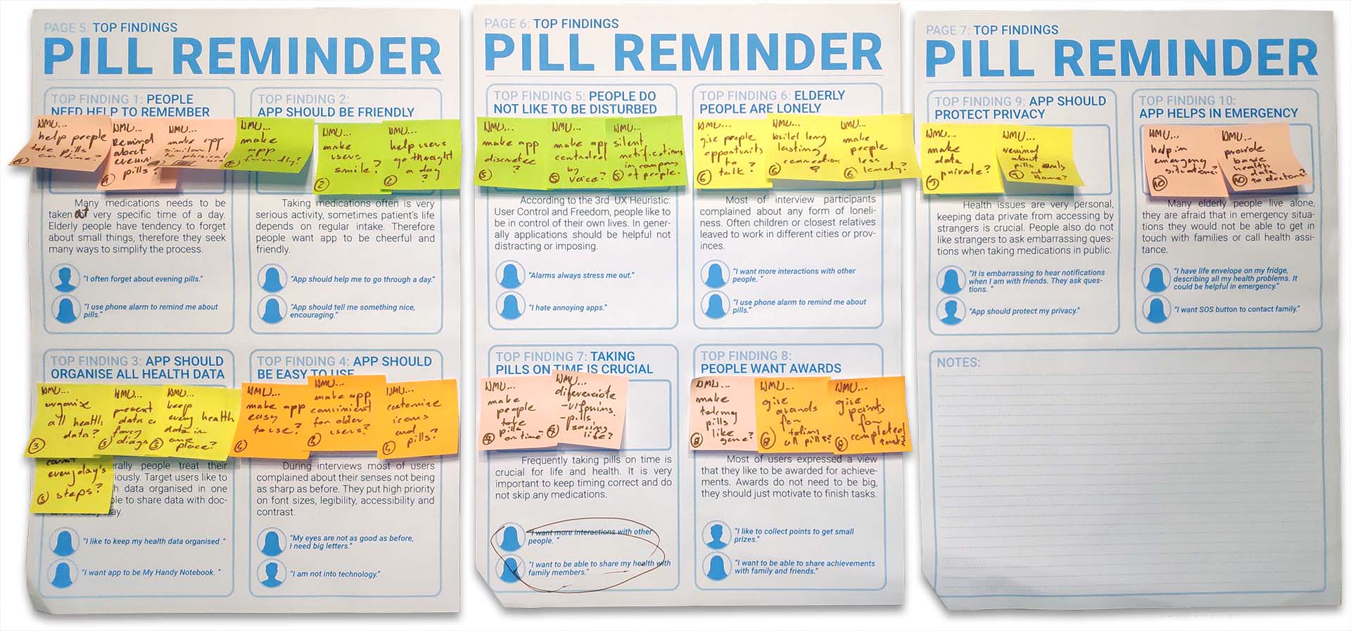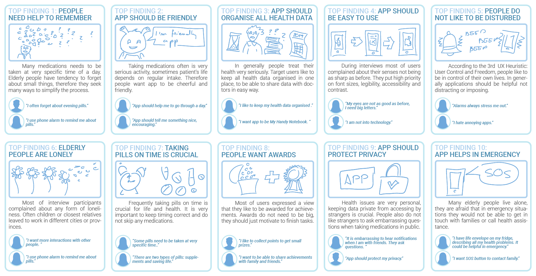 The 10 clustered insights were subsequently organized into the Top Findings. They are 10 really important matters for the users. All of the Top Findings were supported by two user quotations recalled from recorded interviews.