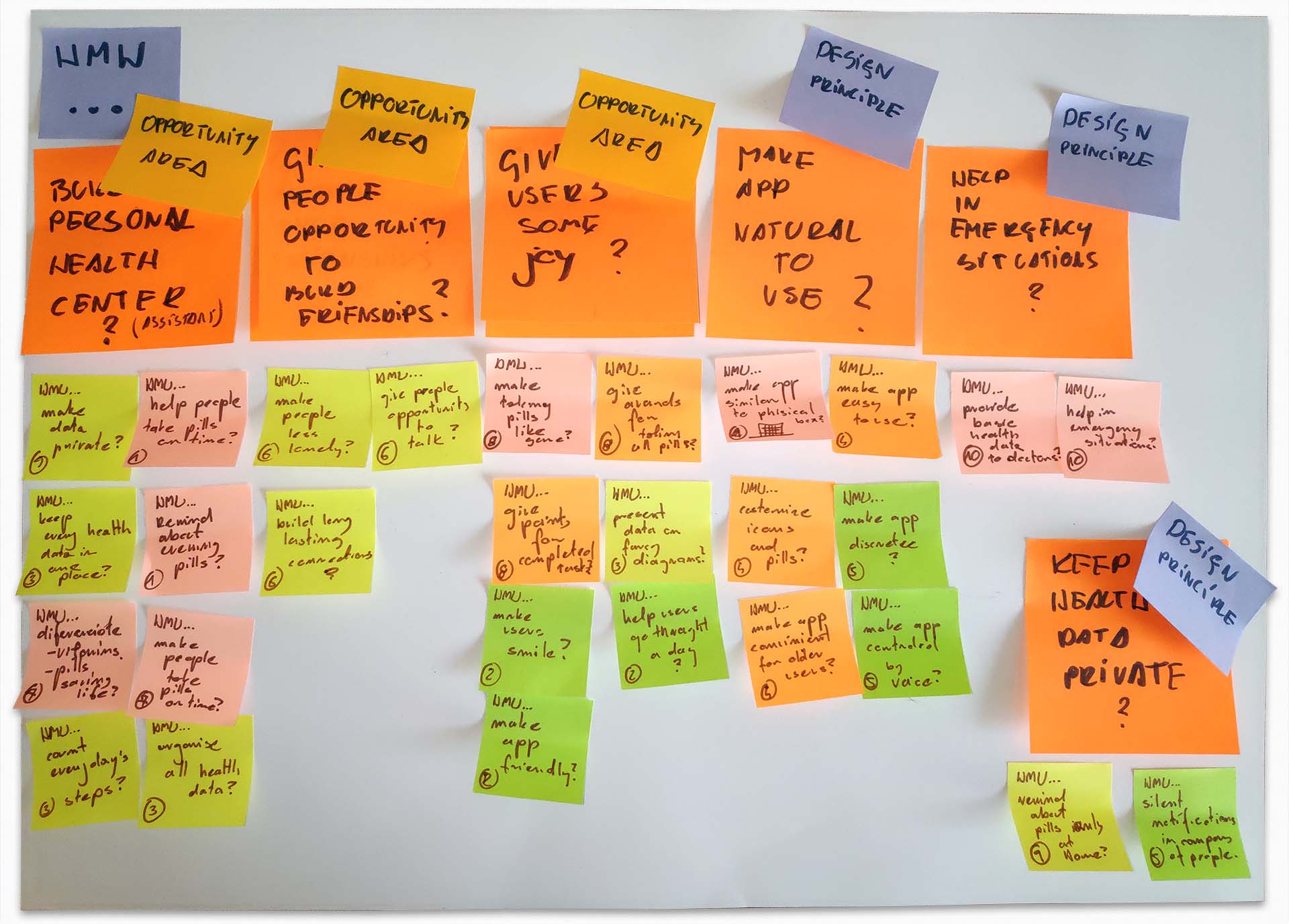 In the next phase, questions were clustered into 3 Opportunity Areas and 3 Design Principles. Opportunity Areas will be used during a brainstorming session for ideation. While Design Principles, on the contrary, will evaluate results.