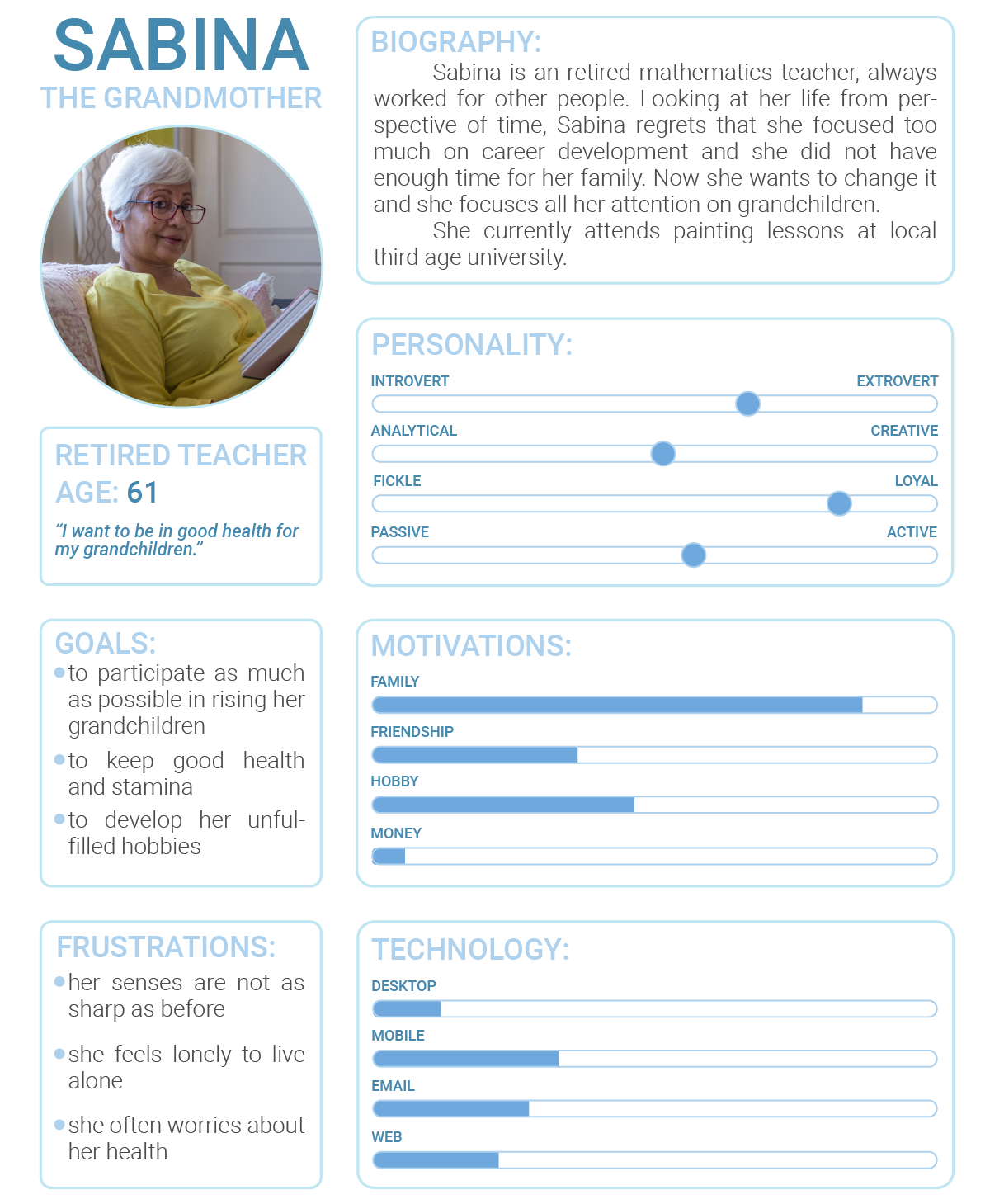 The final step of the Define Phase was to create a Persona. An imagiary user, who averages all mayor personality traits, goals and frustrations of previously interviewed real users. The key role if the Persona is to keep reminding all of the stakeholders for whom are they building a product. She was printed and handed on the whiteboard.